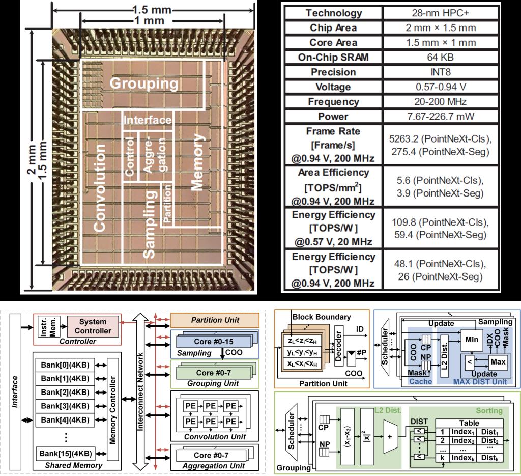 点云是由激光雷达、深度相机等新型传感器采集到的数据格式,由于只抓取物体轮廓上的点,因此相比于传统的图像和视频,点云可以用更少的数据量实现更高的分辨率,在无人驾驶、机器人、无人机、AR/VR等领域有着巨大的应用前景。深度学习技术(点云神经网络)也开始广泛应用于点云的分析和处理。此次pc28开奖预测 的研究工作旨在解决当前点云神经网络计算复杂度高、并行性差以及频繁的不规则外部内存访问,导致在硬件上部署点云神经网络面临的巨大挑战。该研究工作开发了一种用于三维点云分析的高能效神经网络加速器Nebula,采用基于八叉树的自适应分块、基于采样的多级跳过以及基于流水线的分块延迟聚合,分别解决了点云神经网络中最远点采样的串行计算带来的高延迟、大量的冗余计算以及频繁的非规则访存。该工作采用了28纳米工艺进行了流片验证,芯片的峰值能效达到了109.8 TOPS/W(20 MHz,INT8),峰值帧率和峰值面积效率分别达到了5263fps和5.6 TOPS/mm2(200 MHz,INT8),远超当前的国际领先水平。此项研究工作为后续在自动驾驶、机器人等新兴领域的应用提供了广泛的思路。