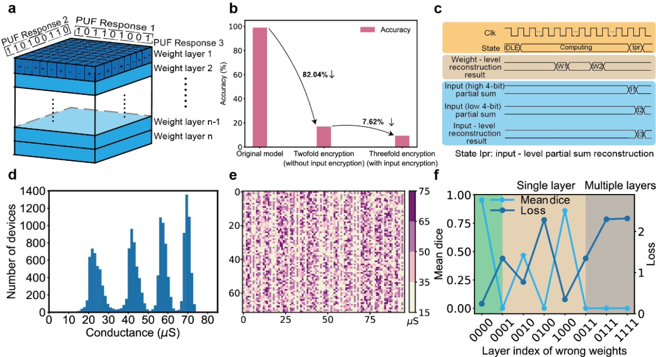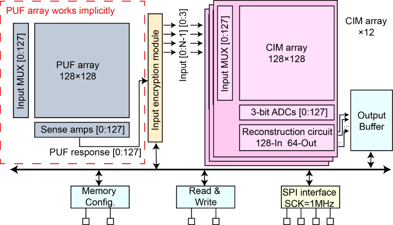 基于电阻式随机存取存储器(RRAM)的存内计算(CIM)已成为一种具有高度发展潜力的技术,可用于加速边缘设备上的神经网络。存内计算可以直接在存储器中执行乘法累加操作,从而显著减少频繁的数据传输并提高能效。然而,由于RRAM 的非易失性特性,使用者可以在计算过程中从存内计算内核中提取存储的神经网络权重。物理不可克隆函数(PUF)是一种利用每个实体的固有随机性为每个实体提供唯一信息的器件。过去的工作曾提出,PUF能够用于保护神经网络的知识产权,但是其硬件开销仍然较高。目前仍缺乏有效实施PUF和存内计算核心集成的方法,以提供有保护且高效的人工智能推理。