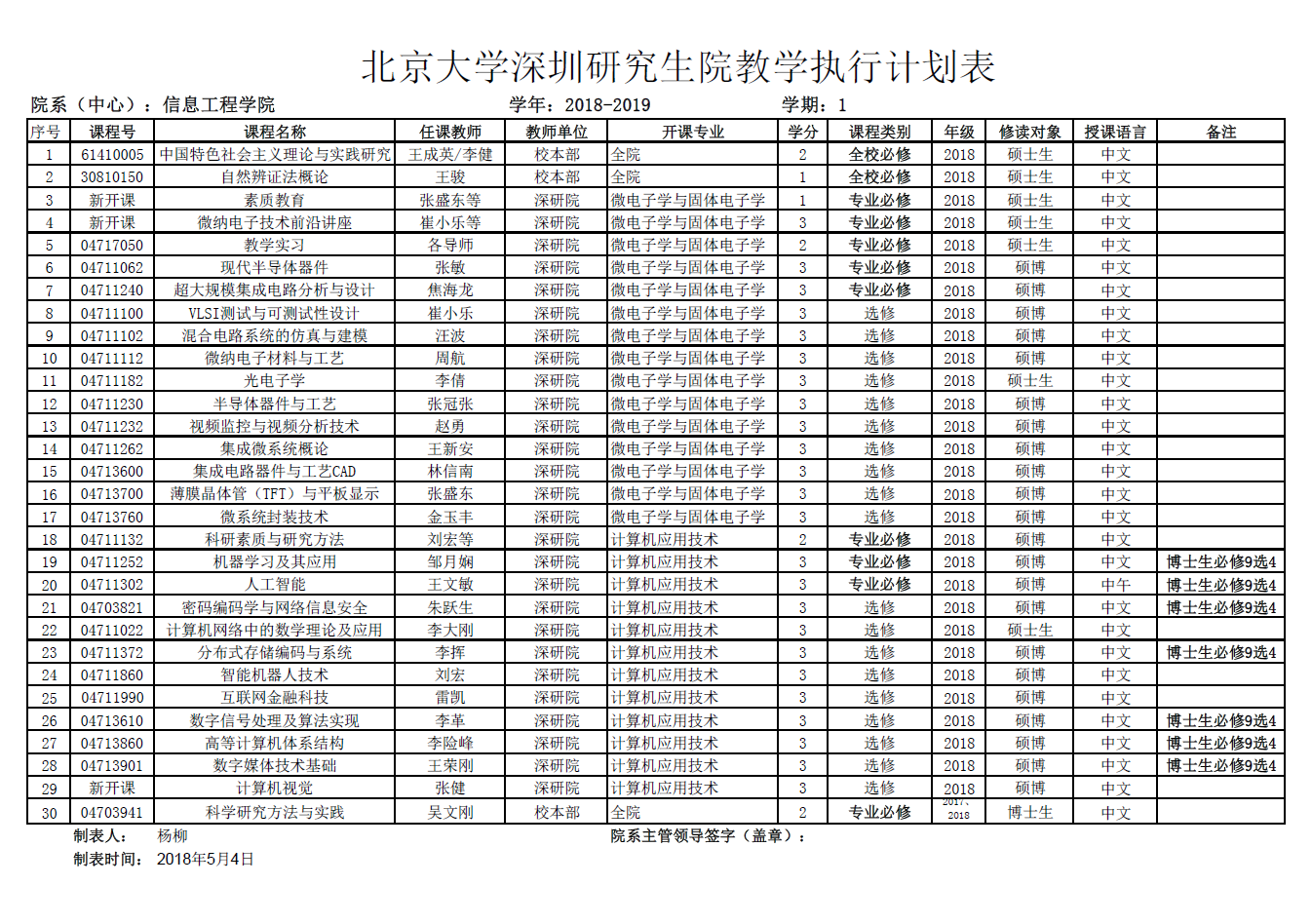北京大学深圳研究生院2018-2019学年第一学期执行计划