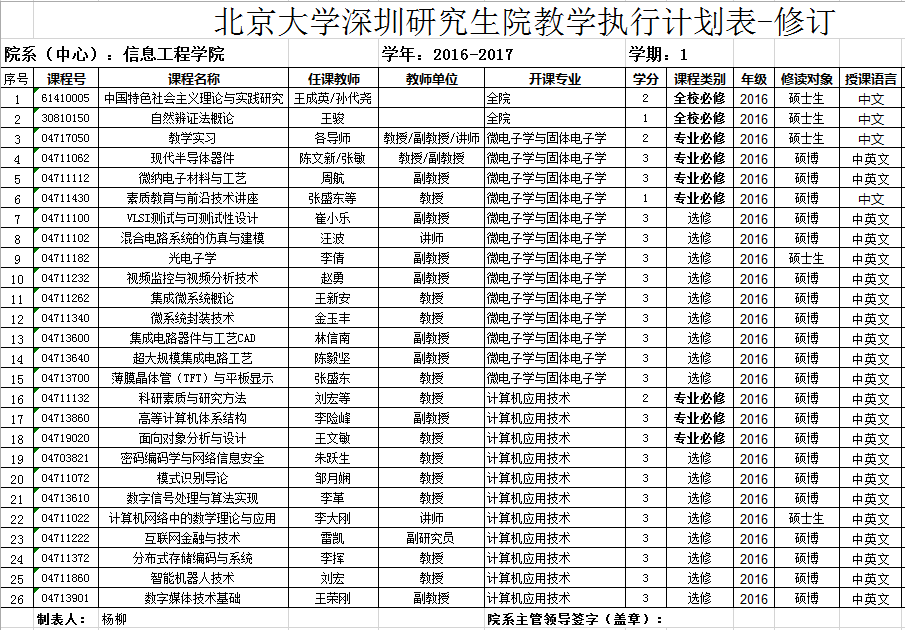 北京大学深圳研究生院2016-2017学年第一学期执行计划