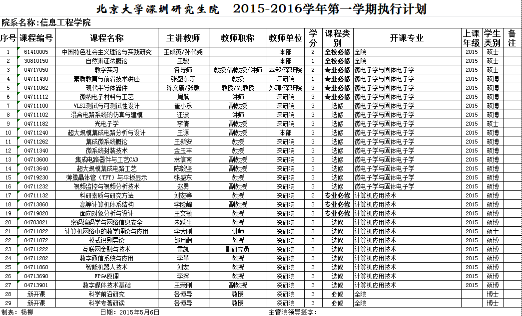 北京大学深圳研究生院2015-2016学年第一学期执行计划