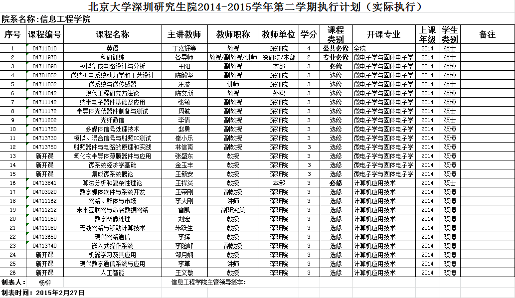 北京大学深圳研究生院2014-2015学年第二学期执行计划