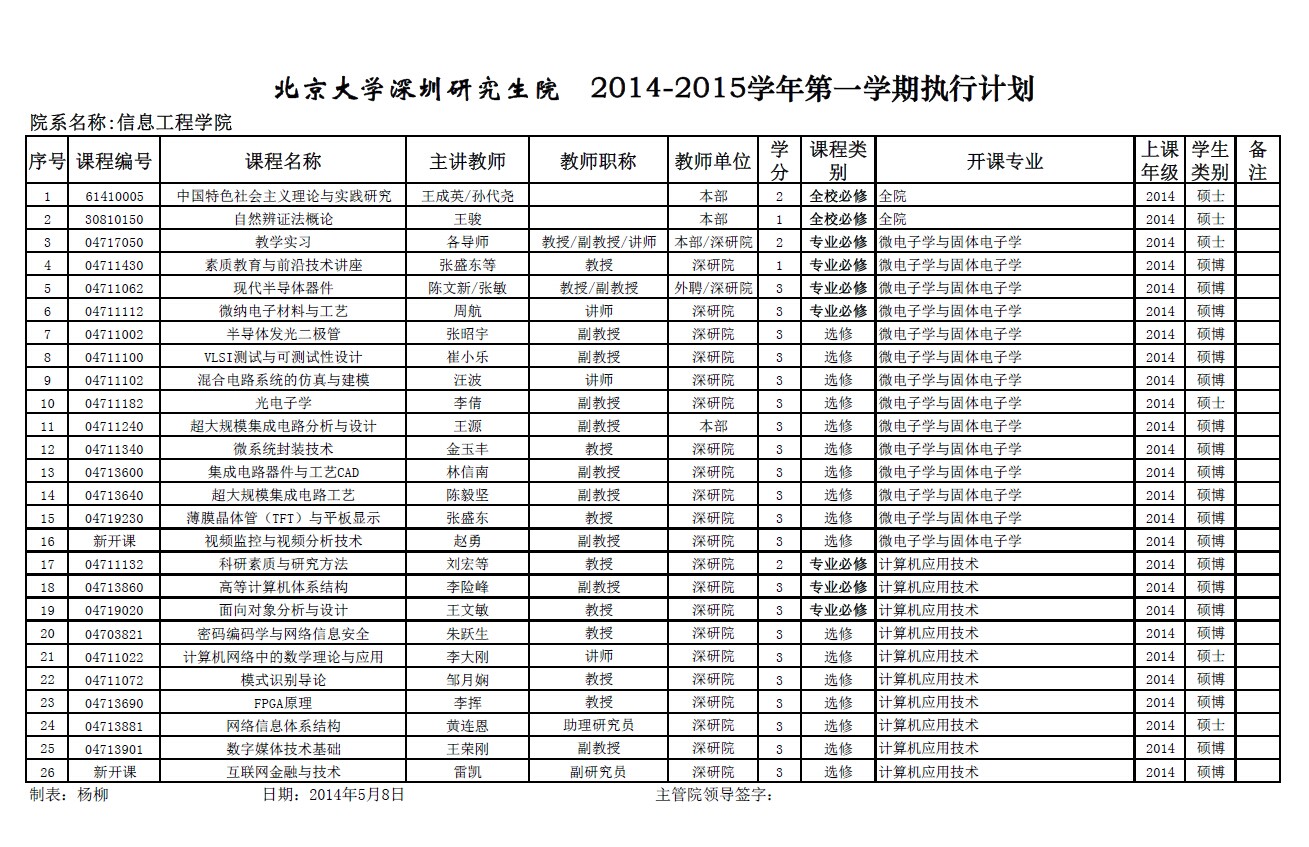 北京大学深圳研究生院2014-2015学年第一学期执行计划