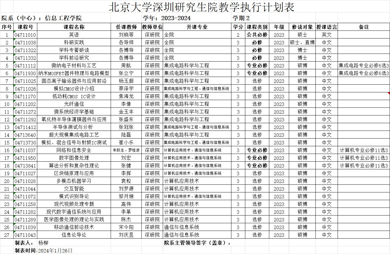 北京大学深圳研究生院2023-2024学年第二学期教学执行计划