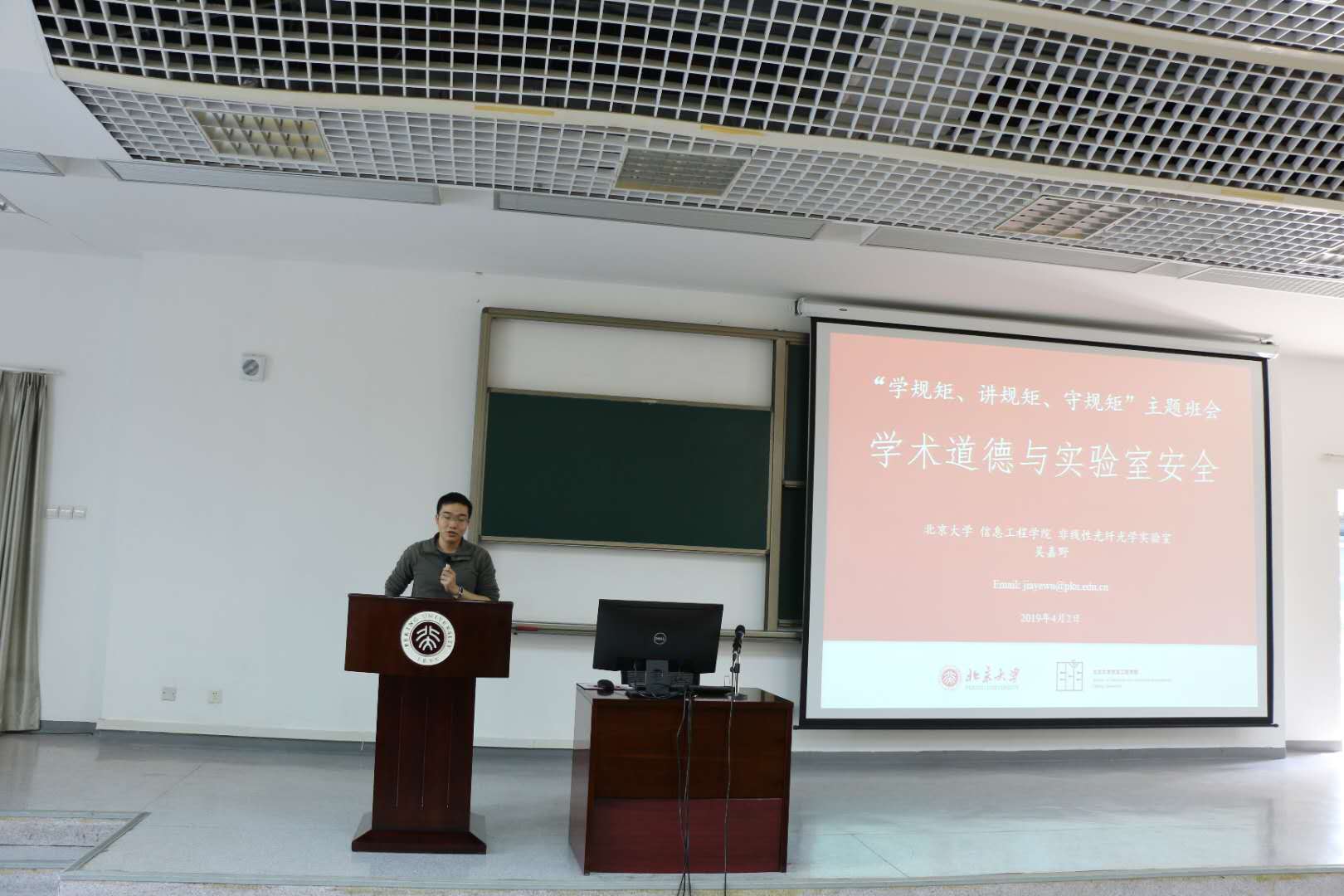 接着,2018级微电子2班班长吴嘉野同学进行了学术道德与实验室安全宣传演讲。首先,强调了此次宣传对于各年级同学的意义:研究生一年级的同学正在陆续展开各自的课题研究,需要在学术上“扣好人生第一粒扣子”,端正对学术道德和实验室安全的认识;研究生二年级的同学正在进行各类科研活动,此类宣传作为一个提醒显得尤为重要;而研究生三年级的同学正在进行毕业论文写作,更加需要重视学术道德,避免产生学术不端的问题。