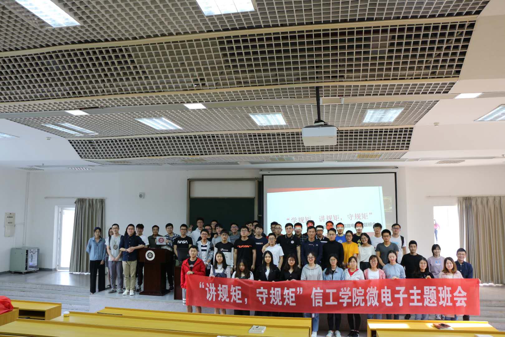 2019年4月2日下午3点,pc28开奖预测微电子学与固体电子学专业的三个年级在D栋阶梯教室共同举行“学规矩、讲规矩、守规矩”主题联合班会。活动现场气氛活跃,座无虚席。
