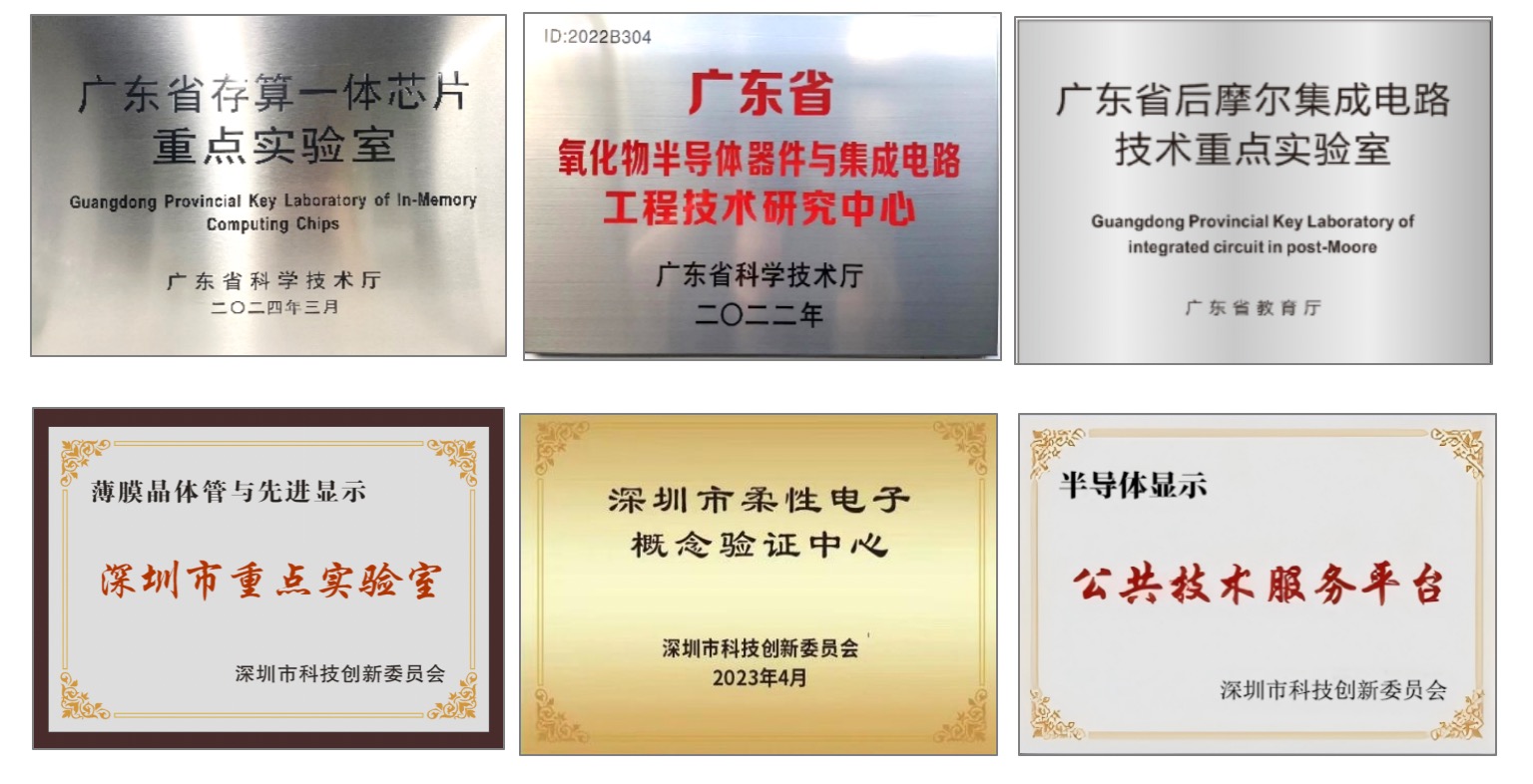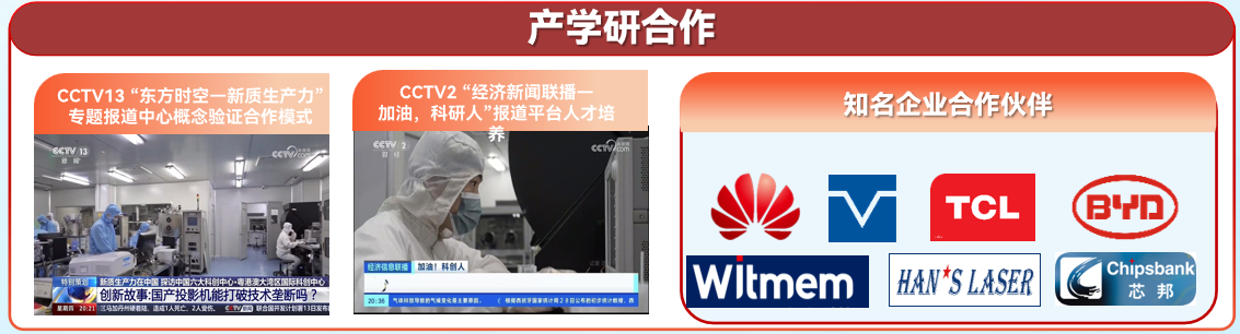 平台依托北京大学的综合学科优势和粤港澳大湾区的电子信息产业优势,与深圳芯邦科技股份有限公司机联合成立存算一体联合实验室,聚焦存算一体芯片的关键技术攻关、产品研发;与香港科技大学协同攻关场序显示技术,为我国打破美日在光机领域的垄断奠定了底层共性技术基础。相关技术已荣获多项国家及地方级奖项,并且作为粤港澳大湾区的科创代表,在科创合作模式及平台人才培养方面,获得了CCTV13《东方时空—新质生产力》专题报道以及 CCTV2《经济新闻联播—加油,科研人》报道。